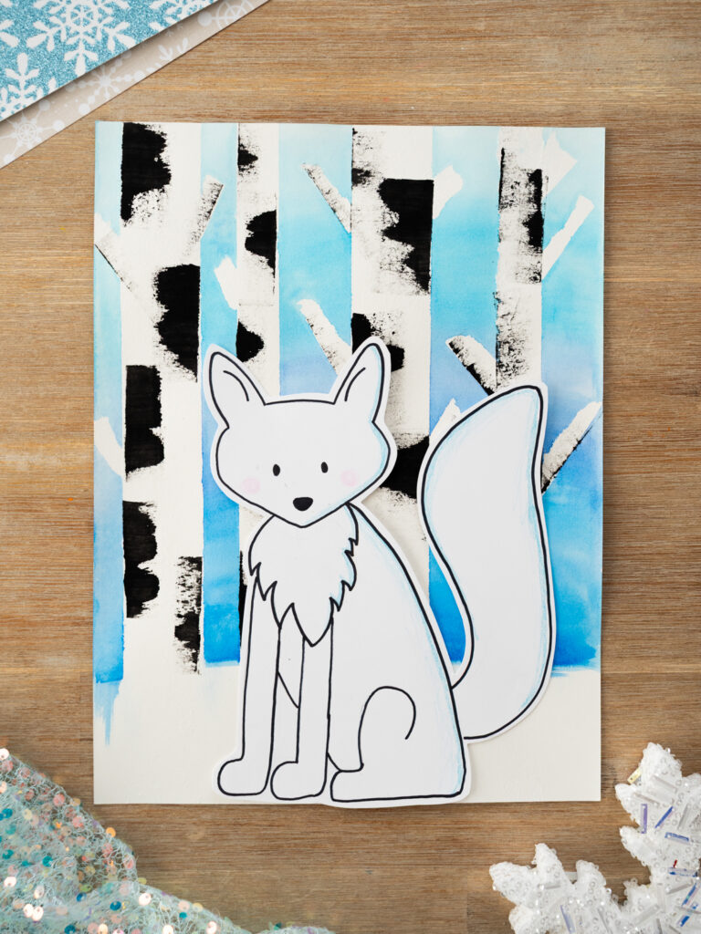 Tape Resist Birch Trees with Arctic Fox